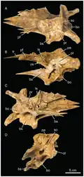 (A) vertèbre cervicale, (B) ilium droit, (C) ischion droit et (D) os complexes tibio-astragalaires droits de Alioramus altai.