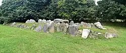 Au débouché du couloir dans la chambre, une structure de type coffre a été découverte lors des fouilles à environ 0,30 m à 0,40 m sous le sol d'origine de la chambre. Elle renfermait une série de cinq vases[3].
