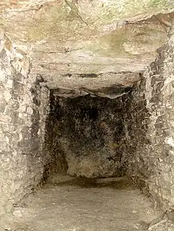 Lors des fouilles, Louis Leguay constata que la partie arrière à l'ouest de la chambre avait subi un effondrement partiel, durant sa période d'utilisation, effondrement qui bouleversa la disposition d'origine des corps inhumés. Selon Leguay, les corps furent déposés en position assise, adossés au mur. Un squelette d'enfant fut même retrouvé en position verticale. On ne dispose d'aucun décompte précis du nombre de corps ensevelis mais onze crânes y furent découverts[1].