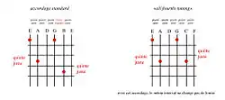 L'accordage en quartes ne pose pas ce problème, chaque corde est la quarte juste de la corde précédente. Ainsi toutes les positions (accords, triades, intervalles) sont identiques partout sur le manche.