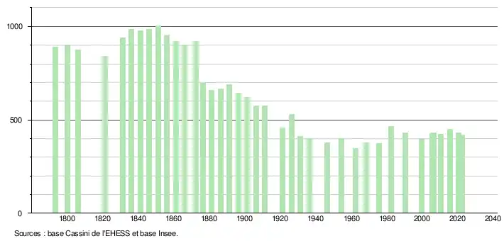L'évolution du nombre d'habitants est connue à travers les recensements de la population effectués dans la commune depuis 1793. Pour les communes de moins de 10 000 habitants, une enquête de recensement portant sur toute la population est réalisée tous les cinq ans, les populations de référence des années intermédiaires étant quant à elles estimées par interpolation ou extrapolation[28]. Pour la commune, le premier recensement exhaustif entrant dans le cadre du nouveau dispositif a été réalisé en 2005[29].
