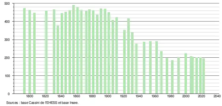 - ↑ Population municipale de référence en vigueur au 1er janvier 2025, millésimée 2022, définie dans les limites territoriales en vigueur au 1er janvier 2024, date de référence statistique : 1er janvier 2022.