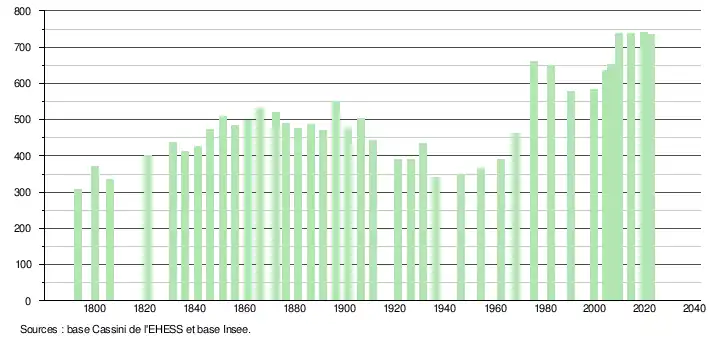 L'évolution du nombre d'habitants est connue à travers les recensements de la population effectués dans la commune depuis 1793. Pour les communes de moins de 10 000 habitants, une enquête de recensement portant sur toute la population est réalisée tous les cinq ans, les populations de référence des années intermédiaires étant quant à elles estimées par interpolation ou extrapolation[19]. Pour la commune, le premier recensement exhaustif entrant dans le cadre du nouveau dispositif a été réalisé en 2004[20].