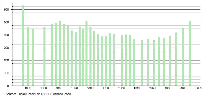 - ↑ Par convention dans Wikipédia, le principe a été retenu de n’afficher dans le tableau des recensements et le graphique, pour les populations légales postérieures à 1999, que les populations correspondant à une enquête exhaustive de recensement pour les communes de moins de 10 000 habitants, et que les populations des années 2006, 2011, 2016, etc. pour les communes de plus de 10 000 habitants, ainsi que la dernière population légale publiée par l’Insee pour l'ensemble des communes.