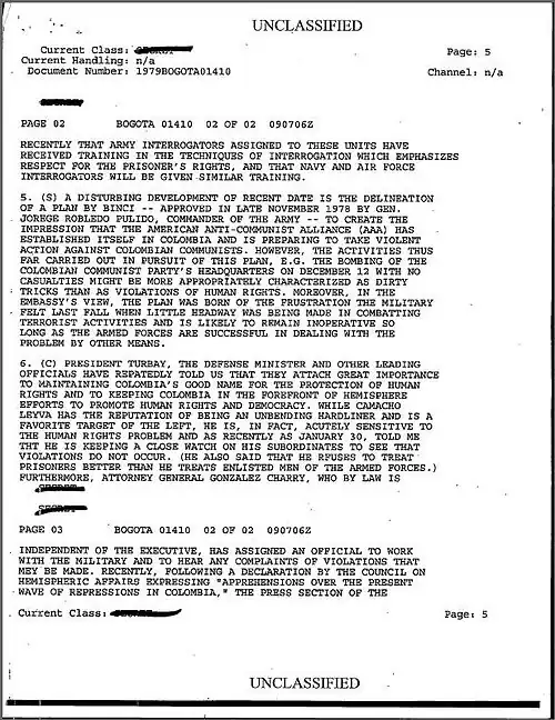 - ↑ « Documentos desclasificados Embajada de EEUU en Colombia »