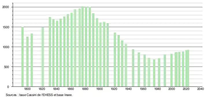 L'évolution du nombre d'habitants est connue à travers les recensements de la population effectués dans la commune depuis 1793. Pour les communes de moins de 10 000 habitants, une enquête de recensement portant sur toute la population est réalisée tous les cinq ans, les populations de référence des années intermédiaires étant quant à elles estimées par interpolation ou extrapolation[17]. Pour la commune, le premier recensement exhaustif entrant dans le cadre du nouveau dispositif a été réalisé en 2005[18].