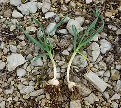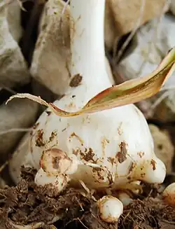 - Cet Allium a bien sûr un bulbe. Celui-ci est double. Il est entouré de nombreux bulbilles blancs, ce qui constitue un élément caractéristique de l'espèce.