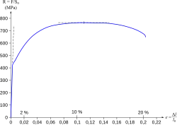 - l’allongement limite (yield Point Elongation ou YPE) : pour les matériaux qui possèdent un point limite d'élasticité, augmentation de la déformation sans augmentation de la contrainte, et domaine de cet allongement.