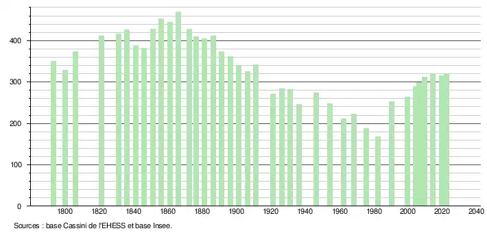 L'évolution du nombre d'habitants est connue à travers les recensements de la population effectués dans la commune depuis 1793. Pour les communes de moins de 10 000 habitants, une enquête de recensement portant sur toute la population est réalisée tous les cinq ans, les populations de référence des années intermédiaires étant quant à elles estimées par interpolation ou extrapolation[26]. Pour la commune, le premier recensement exhaustif entrant dans le cadre du nouveau dispositif a été réalisé en 2004[27].