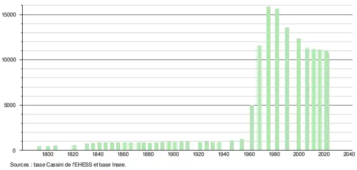- ↑ Par convention dans Wikipédia, le principe a été retenu de n’afficher dans le tableau des recensements et le graphique, pour les populations de référence postérieures à 1999, que les populations correspondant à une enquête exhaustive de recensement pour les communes de moins de 10 000 habitants, et que les populations des années 2006, 2011, 2016, etc. pour les communes de plus de 10 000 habitants, ainsi que la dernière population de référence publiée par l’Insee pour l'ensemble des communes.