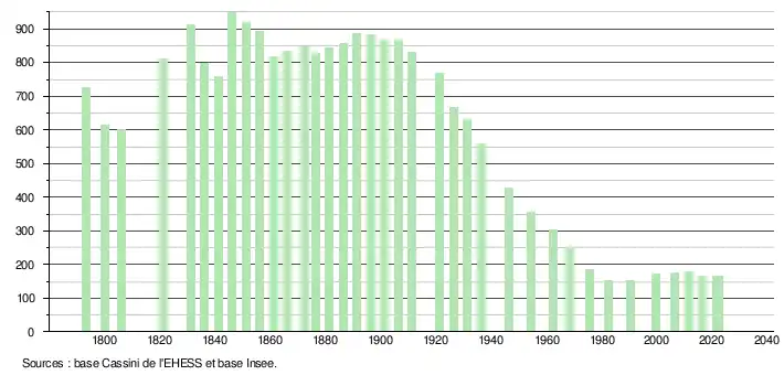 | L'évolution du nombre d'habitants est connue à travers les recensements de la population effectués dans la commune depuis 1793. Pour les communes de moins de 10 000 habitants, une enquête de recensement portant sur toute la population est réalisée tous les cinq ans, les populations de référence des années intermédiaires étant quant à elles estimées par interpolation ou extrapolation[33]. Pour la commune, le premier recensement exhaustif entrant dans le cadre du nouveau dispositif a été réalisé en 2006[34]. En 2022, la commune comptait 167 habitants[Note 2], en évolution de +1,83 % par rapport à 2016 (Lot-et-Garonne : −0,18 %, France hors Mayotte : +2,11 %). |