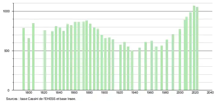 L'évolution du nombre d'habitants est connue à travers les recensements de la population effectués dans la commune depuis 1793. Pour les communes de moins de 10 000 habitants, une enquête de recensement portant sur toute la population est réalisée tous les cinq ans, les populations de référence des années intermédiaires étant quant à elles estimées par interpolation ou extrapolation[21]. Pour la commune, le premier recensement exhaustif entrant dans le cadre du nouveau dispositif a été réalisé en 2008[22].