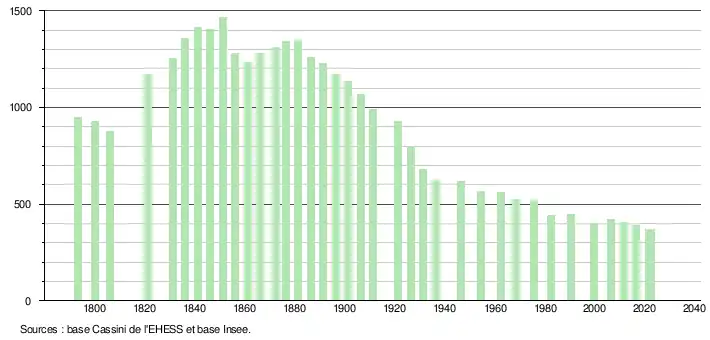 L'évolution du nombre d'habitants est connue à travers les recensements de la population effectués dans la commune depuis 1793. Pour les communes de moins de 10 000 habitants, une enquête de recensement portant sur toute la population est réalisée tous les cinq ans, les populations de référence des années intermédiaires étant quant à elles estimées par interpolation ou extrapolation[19]. Pour la commune, le premier recensement exhaustif entrant dans le cadre du nouveau dispositif a été réalisé en 2006[20].