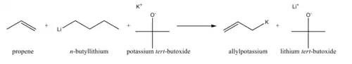 Une voie de synthèse possible de l’allypotassium est une réaction de métallation dans de l’hexane à −45 °C, faisant réagir le propène et le tert-butoxyde de potassium en présence de n-butyllithium. Le rendement de synthèse est de 63 % et un produit secondaire, le tert-butoxide de lithium, est obtenu[5].