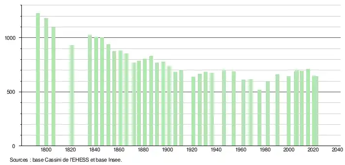 L'évolution du nombre d'habitants est connue à travers les recensements de la population effectués dans la commune depuis 1793. Pour les communes de moins de 10 000 habitants, une enquête de recensement portant sur toute la population est réalisée tous les cinq ans, les populations de référence des années intermédiaires étant quant à elles estimées par interpolation ou extrapolation[34]. Pour la commune, le premier recensement exhaustif entrant dans le cadre du nouveau dispositif a été réalisé en 2005[35].