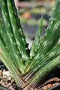 • Le bouturage se pratique principalement pour les espèces rampantes, car souvent très ramifiées. On l'effectue également avec des branches d'aloès dits arbustifs comme A. plicatilis ou A. dicotoma. Bien que moins pratique que la division des touffes, le bouturage par feuille est possible[11]. Il suffit de prélever une bouture et, après avoir fait cicatriser la plaie quelques jours, de l'enfoncer de quelques centimètres dans un mélange pour semis. Laisser sécher entre deux arrosages.