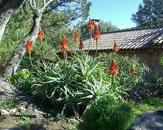 Cette plante forme des rosettes denses pouvant atteindre 1,5 à 2 m de hauteur. Les feuilles épaisses et effilées, de couleur gris-vert tacheté de blanc, à la marge dentelée, sont recourbées vers le haut. La hampe florale unique, d'une longueur d'environ 1 m, apparaît vers le milieu de l'hiver. Les fleurs rouge orangé sont pollinisées par des oiseaux de la famille des nectariniidés.