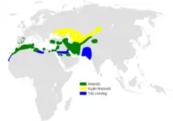 Cette espèce niche en Espagne, en Afrique du Nord et depuis la Turquie, à travers les zones semi-arides d'Asie centrale jusqu'à la Mongolie et la Chine.