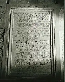 Inscription latine CIL IX, 5439 de Falerio (Picenum) portant le cursus honorum de T. Cornasidius Sabinus qui fut gouverneur de la province des Alpes pennines (procurateur d'Auguste avec le droit de glaive). Ici les Alpes pennines sont rattachées aux Alpes Atractianarum.