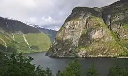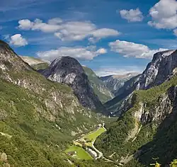 Entre les pics du massif se développe un réseau de vallées pouvant descendre jusqu'à 300 m au-dessus du niveau de la mer à l'est mais parfois bien en dessous du niveau de la mer à l'ouest[F 2]. C'est ainsi que la côte ouest norvégienne est profondément disséquée par un grand nombre de fjords : des vallées glaciaires envahies par la mer[F 4]. Le plus grand de ces fjords, le Sognefjord, entre sur près de 200 km dans les terres[F 4]. Ces fjords et les nombreuses îles font que la longueur totale de la côte[note 2] est de 83 281 km, soit deux fois le périmètre équatorial de la Terre[F 4].