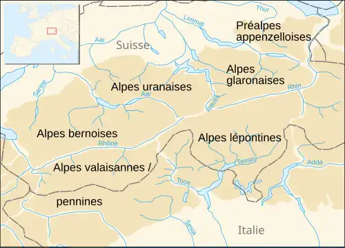 - Alpes uranaises : cantons d'Uri, Berne, Valais, Lucerne, Obwald, Nidwald, séparées des Alpes glaronaises par la Reuss ;