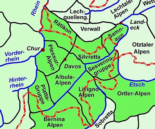 Toutes les chaînes de montagne suivantes sont situées dans le canton des Grisons. De manière traditionnelle, elles font partie des Alpes rhétiques s'étendant jusqu'au col de Resia à l'est, sauf le massif de l'Ortles qui appartient aux Préalpes orientales méridionales.
