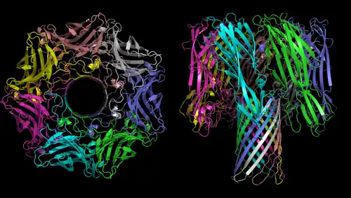 - ↑ (en) Langzhou Song, Michael R. Hobaugh, Christopher Shustak, Stephen Cheley, Hagan Bayley et J. Eric Gouaux, « Structure of Staphylococcal α-Hemolysin, a Heptameric Transmembrane Pore », Science, vol. 274, no 5294, , p. 1859-1866 (PMID 8943190, DOI 10.1126/science.274.5294.1859, Bibcode 1996Sci...274.1859S, lire en ligne)