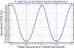 La magnitude apparente de Cor Caroli varie de +2,84 à +2,98, au cours d'un cycle qui dure 5,47 jours[3].