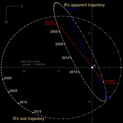 L’approche, ou périastre, la plus récente a été observée en et la prochaine le sera en . La séparation orbitale la plus éloignée, ou apoastre, a eu lieu en et la prochaine sera en 2075. La distance apparente entre A et B diminue rapidement, au moins jusqu'en 2019[10].