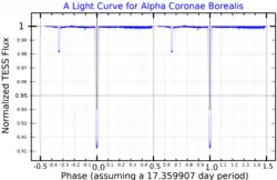 Alphecca est une étoile binaire à éclipses, dont le système est semblable à celui d'Algol (β Per). Ce système a une période de 17,36 jours, avec une magnitude variant entre +2,21 à +2,32 dans la bande B, ce qui est très difficilement notable à l'œil nu[4].