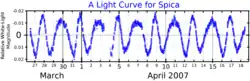 Spica est une étoile binaire spectroscopique et une étoile variable ellipsoïdale ; c'est un système de deux étoiles tellement proches l'une de l'autre qu'elles possèdent une forme ellipsoïdale plutôt que sphérique et qu'elles ne peuvent être séparées que grâce à leurs spectres. Ce sont deux étoiles bleues de type spectral B, dont la composante primaire, qui a déjà quitté la séquence principale, est également une étoile géante variable de type Beta Cephei. Ces deux étoiles s’éloignent de notre système solaire à une vitesse d’environ 1 km par seconde. La magnitude du système varie de +0,92 à +0,98 sur une période de 4,0142 jours, une variation aussi faible étant toutefois très difficile à observer.