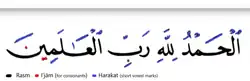 Verset deux de la Fâtiha (Louange à Dieu, Seigneur des Mondes). En noir, le ductus des consonnes et des voyelles longues. En rouge, les points diacritiques qui distinguent les consonnes. En bleu, les signes pour les voyelles brèves, la gémination et les silences (sukûn).un verbe factitif à la 2e personne du masculin singulier de l'impératif كَتِّبْ (kattib, fais écrire — impératif)