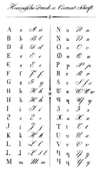 | majuscules | A | B | D | E | Є | F | G | H | I | Ƨ | J | K | L | M | N | O | P | R | S | З | T | U | V | Ƞ | Ɥ | |||||||