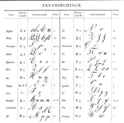 Ci-dessous se trouve un tableau donnant une liste des principales lettres grecques, augmentée de leur romanisation, des lettres phéniciennes dont les grecques sont dérivées. La transcription phonétique utilise l'alphabet phonétique international. La prononciation indiquée pour le grec ancien est une prononciation restituée, dite « érasmienne »[N 3]. Elle est partiellement fautive, et son usage est surtout scolaire. Elle s'efforce d'indiquer la prononciation de la lettre en attique à la fin du Ve et au début du IVe siècle av. J.-C.