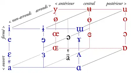Le classement de ces voyelles peut aussi se faire avec une représentation en trois dimensions qui met en évidence les trois critères de classification :