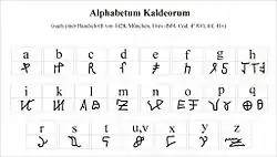 - (de) Cet article est partiellement ou en totalité issu de l’article de Wikipédia en allemand intitulé « Alphabetum Kaldeorum » (voir la liste des auteurs).