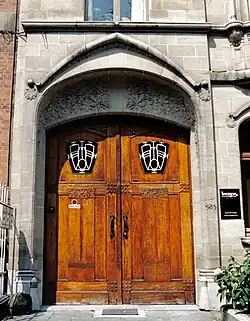 - motifs de feuilles de marronnier omniprésents (porte, fenêtres, bas-relief séparant les deux bâtiments...)