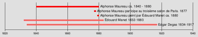 On sait que Maureau est né vers 1840. En 1867, il épouse Mary Locke à La Nouvelle-Orléans[6]. Le mariage est dissous en 1871[7]. Édouard Manet est inclus car il est certain qu'il a rencontré Maureau. Nous le savons à travers le portrait de Maureau par Monet. Il est inhumé au cimetière parisien de Saint-Ouen le 12 avril 1880[8]