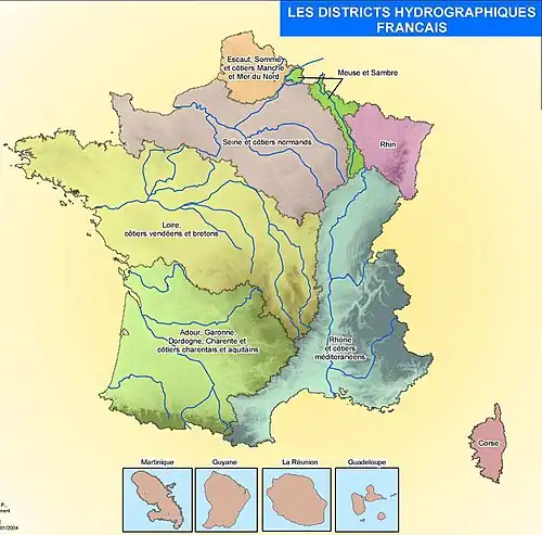 L'Alsace s'étend sur le bassin versant du Rhin[N 4]. La gestion du Rhin (et de la Meuse) relève de l'Agence de l'eau Rhin-Meuse, sise à Metz. Dans le cadre du programme intégré du Rhin[14], la France et l'Allemagne ont aménagé des ouvrages pour écrêter les crues du Rhin. En France, il s'agit du polder d'Erstein (qui intéresse également les communes de Nordhouse et Plobsheim), ainsi que le polder de la Moder, à Fort-Louis. L'Ill constitue la plus grande rivière d'Alsace. À la hauteur du Petit Ried, trois rivières rejoignent le Rhin :