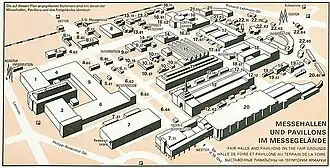 En mai 1946, le premier salon professionnel d'après-guerre eut lieu dans quatre halls[10]. Dans les années qui ont suivi, il y a eu des agrandissements continus ainsi que de nouveaux bâtiments et conversions, y compris le « Pavillon soviétique » [11], le Messehalle 7 (1977)[12], créé en 1950 à partir de l'ancien Achilleion , le hall d'exposition 7 (1977)[12] , le hall d'exposition 22 (1989-1992) et un bâtiment administratif à l'entrée nord[13]. En outre, de nombreux bâtiments plus petits et structures temporaires ont été construits. De 1991 à 1996, quelques salons supplémentaires ont eu lieu avant que les nouveaux halls d'exposition construits au nord de Leipzig ne soient opérationnels en 1996.