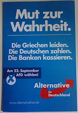 L'AfD rejette pour sa part ces classifications tout en déclarant, à travers Bernd Lucke, n'être « ni de gauche ni de droite »[187]. Si le parti préconise la sortie de l'euro dans une rhétorique aux slogans « accrocheurs » et « populistes »[188], il n'entend cependant pas renoncer à l'intégration européenne[189] affirmant ne pas être « anti-Europe » mais « anti-euro »[190]. Son coprésident et porte-parole, Jörg Meuthen, souligne que « l'AfD doit être un parti bourgeois avec une raison bourgeoise et dotée d'une apparence de sérieux »[191].