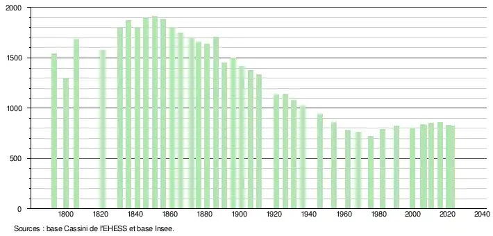 L'évolution du nombre d'habitants est connue à travers les recensements de la population effectués dans la commune depuis 1793. Pour les communes de moins de 10 000 habitants, une enquête de recensement portant sur toute la population est réalisée tous les cinq ans, les populations de référence des années intermédiaires étant quant à elles estimées par interpolation ou extrapolation[35]. Pour la commune, le premier recensement exhaustif entrant dans le cadre du nouveau dispositif a été réalisé en 2005[36].