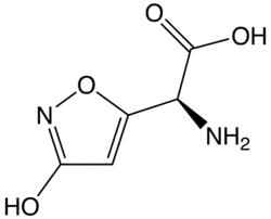 Les deux toxines majeures impliquées dans l'empoisonnement par Amanita muscaria sont le muscimole (3-hydroxy-5-aminométhyl-1-isoxazole, un acide hydroxamique aromatique insaturé) et l'acide iboténique. Le muscimole est le produit de la décarboxylation (habituellement par déshydratation) de l'acide iboténique. Le muscimole et l'acide iboténique ont été découverts au milieu du XXe siècle[39],[40]. Des chercheurs anglais[41], japonais[42] et suisses[40] ont montré que les symptômes de l'intoxication par Amanita muscaria étaient dus essentiellement à ces deux composés, et non à la muscarine[17],[39]. Leur distribution n'est pas uniforme au sein du champignon. La plus grande partie est concentrée dans le chapeau tandis que la base et le pied n'en contiennent qu'une faible quantité[43],[44]. La plus grande partie de l'acide iboténique est excrété dans les urines sous forme inchangée dans les 20 à 90 minutes qui suivent l'ingestion. Lorsque de l'acide iboténique est ingéré seul, il n'y a pratiquement pas de muscimole détectable dans les urines. En revanche la consommation d'Amanita muscaria entraîne une excrétion urinaire de muscimole, les deux composés étant contenus dans le champignon[24].