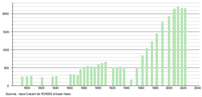 L'évolution du nombre d'habitants est connue à travers les recensements de la population effectués dans la commune depuis 1793. Pour les communes de moins de 10 000 habitants, une enquête de recensement portant sur toute la population est réalisée tous les cinq ans, les populations de référence des années intermédiaires étant quant à elles estimées par interpolation ou extrapolation[18]. Pour la commune, le premier recensement exhaustif entrant dans le cadre du nouveau dispositif a été réalisé en 2007[19].