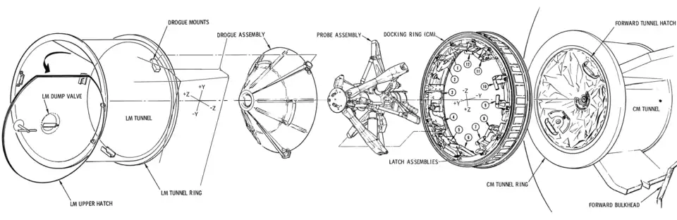 Système d'amarrage sonde-cône des deux modules d'Apollo: le CM, en bas, et le LM, en haut.