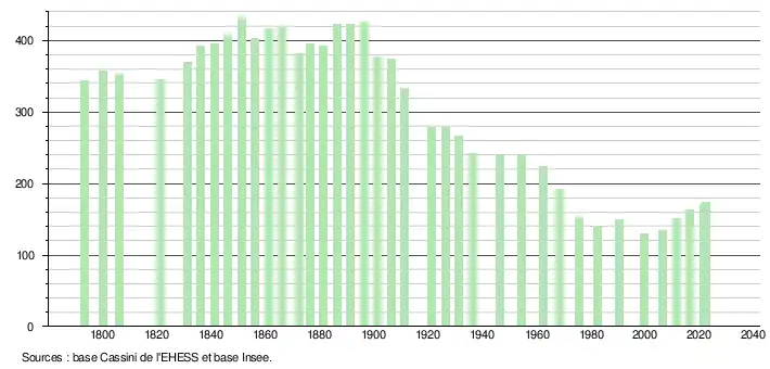L'évolution du nombre d'habitants est connue à travers les recensements de la population effectués dans la commune depuis 1793. Pour les communes de moins de 10 000 habitants, une enquête de recensement portant sur toute la population est réalisée tous les cinq ans, les populations de référence des années intermédiaires étant quant à elles estimées par interpolation ou extrapolation[16]. Pour la commune, le premier recensement exhaustif entrant dans le cadre du nouveau dispositif a été réalisé en 2006[17].