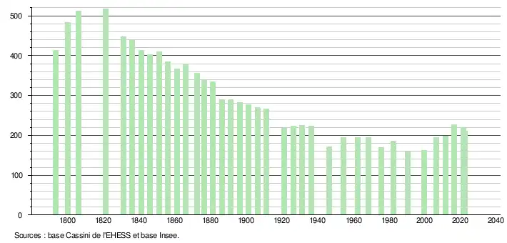 L'évolution du nombre d'habitants est connue à travers les recensements de la population effectués dans la commune depuis 1793. Pour les communes de moins de 10 000 habitants, une enquête de recensement portant sur toute la population est réalisée tous les cinq ans, les populations de référence des années intermédiaires étant quant à elles estimées par interpolation ou extrapolation[30]. Pour la commune, le premier recensement exhaustif entrant dans le cadre du nouveau dispositif a été réalisé en 2006[31].