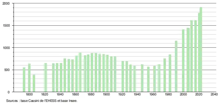L'évolution du nombre d'habitants est connue à travers les recensements de la population effectués dans la commune depuis 1793. Pour les communes de moins de 10 000 habitants, une enquête de recensement portant sur toute la population est réalisée tous les cinq ans, les populations de référence des années intermédiaires étant quant à elles estimées par interpolation ou extrapolation[25]. Pour la commune, le premier recensement exhaustif entrant dans le cadre du nouveau dispositif a été réalisé en 2005[26].