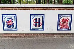 Une fresque antiaméricaine devant l'ancienne ambassade, détournant le grand sceau des États-Unis.
