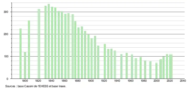 L'évolution du nombre d'habitants est connue à travers les recensements de la population effectués dans la commune depuis 1793. Pour les communes de moins de 10 000 habitants, une enquête de recensement portant sur toute la population est réalisée tous les cinq ans, les populations de référence des années intermédiaires étant quant à elles estimées par interpolation ou extrapolation[28]. Pour la commune, le premier recensement exhaustif entrant dans le cadre du nouveau dispositif a été réalisé en 2005[29].